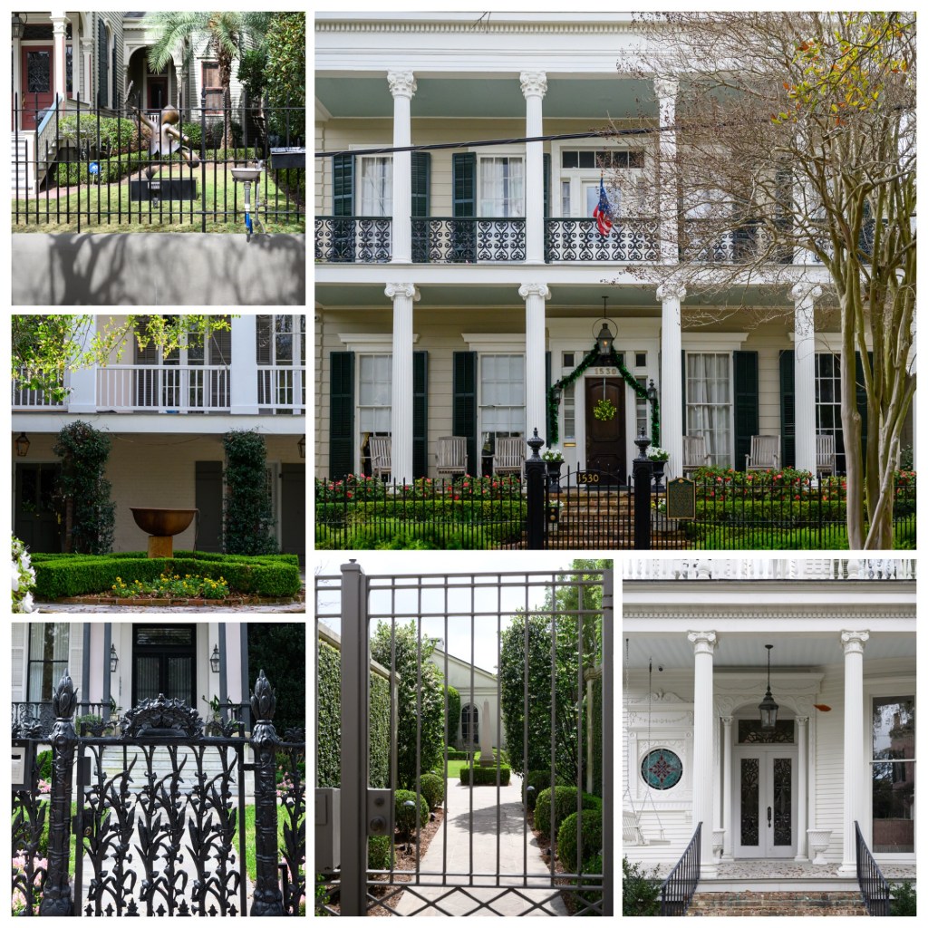 We walked around the Garden District, following a self-guided tour that the concierge had given us. It’s quite an interesting area; some of the houses are enormous – upwards of 11,000 sq ft – and are all on lots just big enough to fit the building. Some of them have high walls or shrubs around them, but most are just open to the street. Each house in the guide has a story – who built it, which architect designed it, how it passed down through owners over the centuries, etc. – none of which I remember (1). And the architecture, including the fences and railings, were often very ornate.