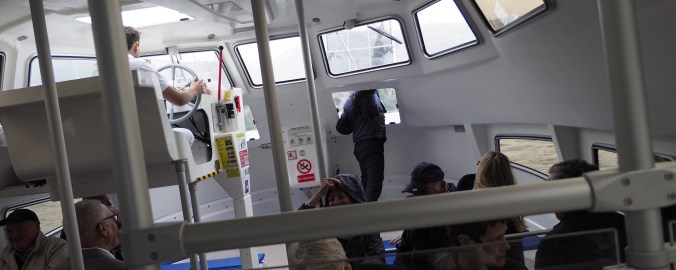 A cruise ship uses its tenders to ferry passengers between the ship and the shore when there’s no suitable dock to tie up at. The ship drops anchor in the port, and deploys two of the craft that are hopefully never used as lifeboats. They are sparse, with hard plastic seats, and room for over 100 passengers in tender operation. They are designed to not sink in rough seas, but are not designed to be especially stable.