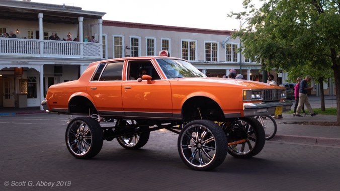 Later in the early evening I was walking by the Plaza and observed another highly customized car circling the area, time after time. Like the low-rider in the picture above, these are really sculptures and not suitable for serious use as vehicles due to their extreme modifications. But some of them are quite impressive.