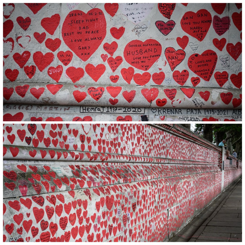 Along the promenade on the south side of the Thames is a seemingly endless wall that’s been turned into a Covid memorial. Volunteers painted hearts across the length of the wall and encouraged those who lost someone to write a brief message in the hearts. The volunteers try and maintain the memorial by overwriting the messages as they fade.