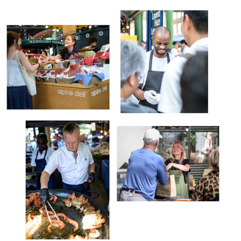 The Market was extremely crowded, as much of London is these days. And the weather has progressively warmed up this week, reaching about 90F on Friday. This temperature is hot in the US, but is brutal hee where many homes don’t have A/C. The Market itself is covered but open air, and the heat is compounded by the crowds and all of the hot food preparation going on. I don’t know what the temperature reached inside, but it was oppressive.