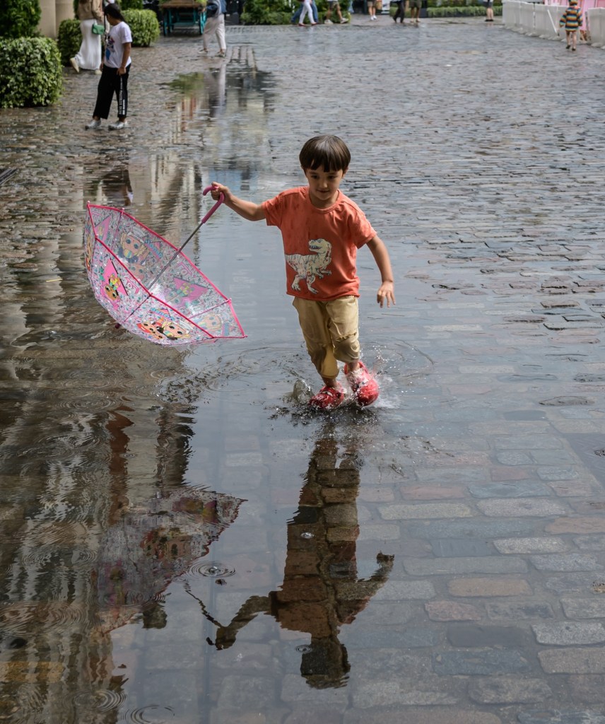 We watched as people scurried by, but were captivated by a small boy who had the best idea and made a game out of the puddles.