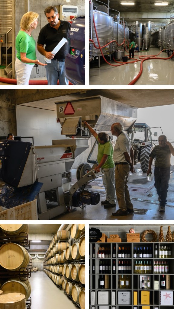 After stopping for a not very good lunch at a restaurant with a very good view by the sea, we went on to a private winery visit. The Quinta de Chocapalha winery is a family run business, with the parents and several of their children active in running the vineyard and making the wine. We’ve been to any number of wineries, including earlier on this trip, but this was a first in two regards: it was just the two of us with Alice Tavares, one of the owners, and it was the first time we managed to be there as the grapes were being brought in from the fields. We were able to watch the stems being removed as the first step before crushing.