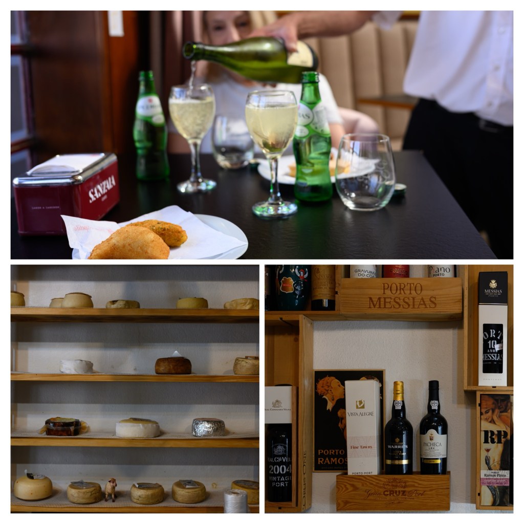The next stop was for some savories to represent a typical breakfast. First off, remember that we finished our hotel breakfast a little over an hour earlier. Secondly, I am skeptical that most Portuguese start their day with green Port wine. But here we were, being served white green (2) Port, a cod cake in potato, and a veal something or other.