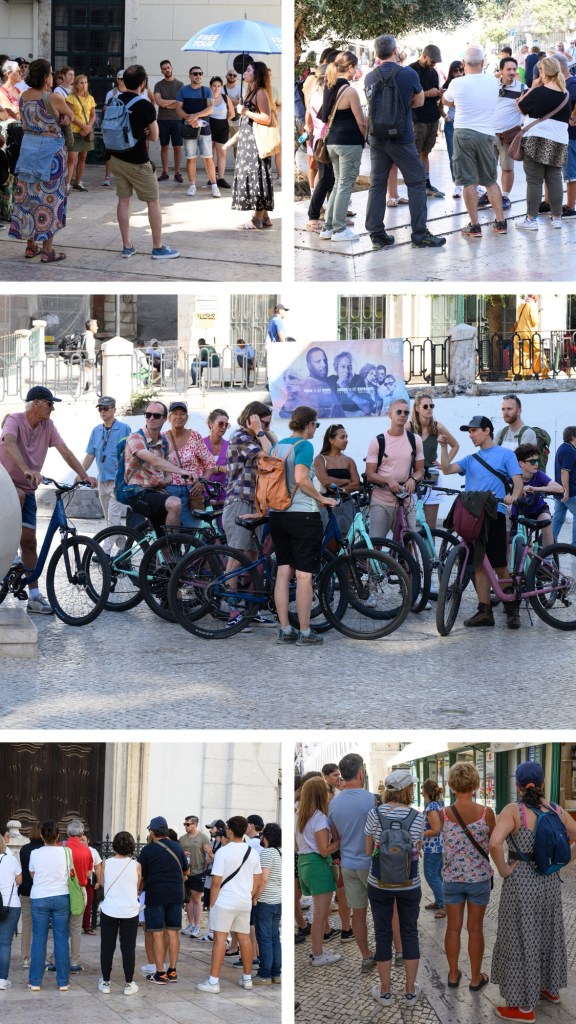 We started by walking down Avenue de Liberdade (Liberty Avenue), where the Hotel Valverde is. As I mentioned, this is a very wide street with a large grassy mall and pedestrian areas, plus lots of traffic. It’s lined with shops, restaurants, hotels and offices and is very busy. We wove our way down the avenue dodging other pedestrians and sidewalk construction, and along the way she pointed out various important buildings. An old theater, an elevator to take people up to the hills surrounding this flat part of the center city, a funicular to a different hill, a monument to some king or other.