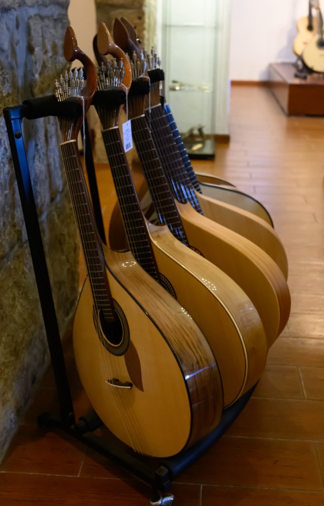 The place was indeed quite small. They had 20 or 30 antique guitars, mostly Portuguese, and another 20 for sale. They also had a selection of ukuleles and small guitars for sale (3). Like guitars sold in the US, Portuguese guitars come in a range of prices and designs. The prices we saw in this store went from EUR 500 to 7,500.