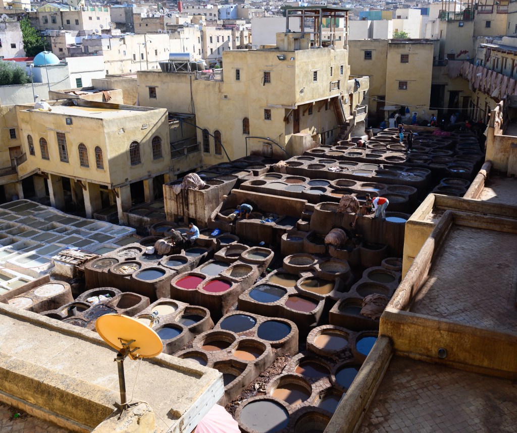 Our last (4) sponsored stop was at a leather factory. Our guide warned us repeatedly that the smell would be bad, and I would say it wasn’t good, but I’ve smelled much worse. After climbing an uncountable number of flights to the top floor, we could look out over the yard where the camel skins were being prepared and dyed. Again, it was interesting. But I really didn’t want to buy a leather jacket or ottoman.